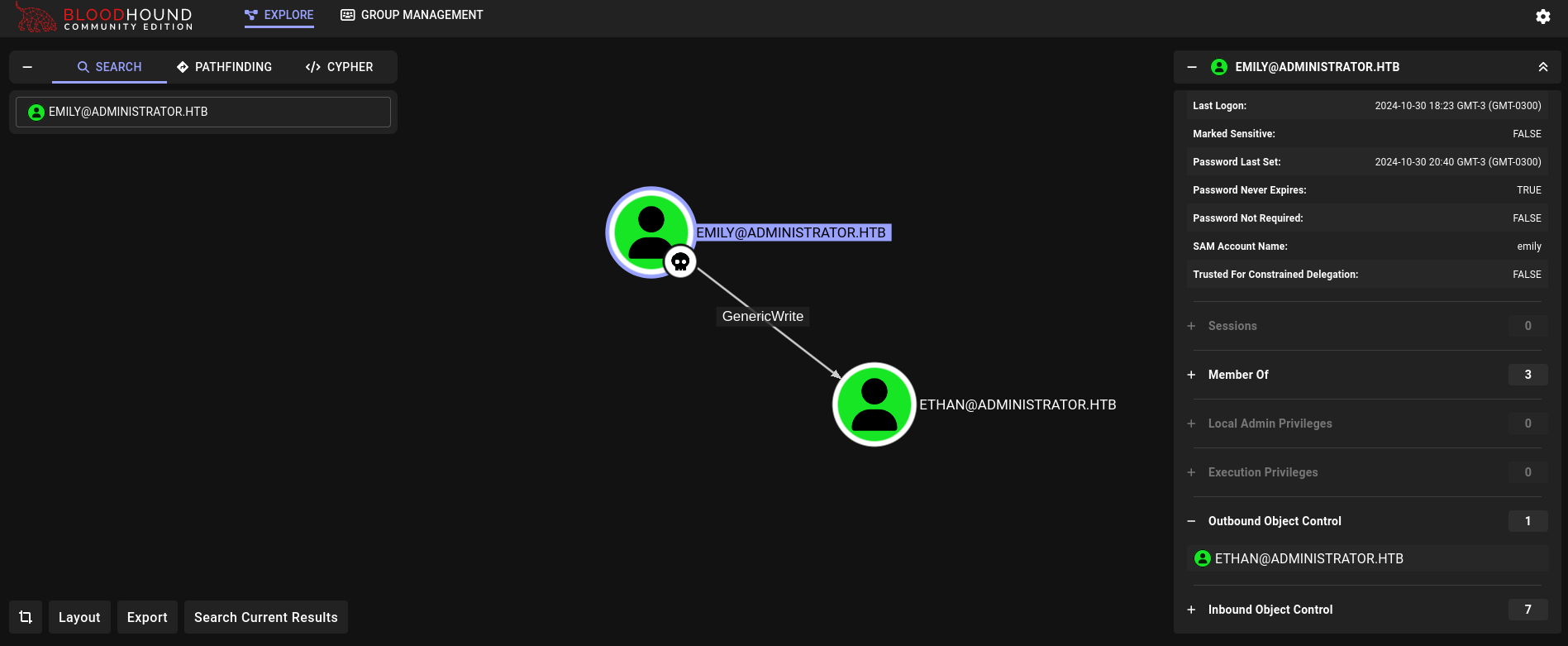 Back to Bloodhound, we can check what can this user do. It has GenericWrite permissions over ethan user: